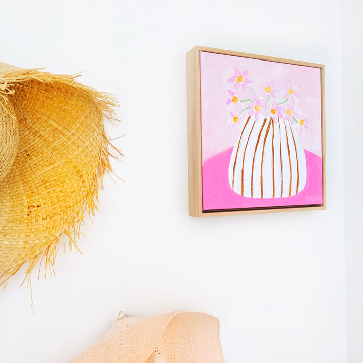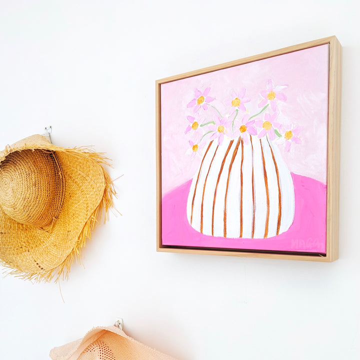 Acrylic on hand stretched canvas framed timber. Artwork comes with a wire ready to hang on the wall.