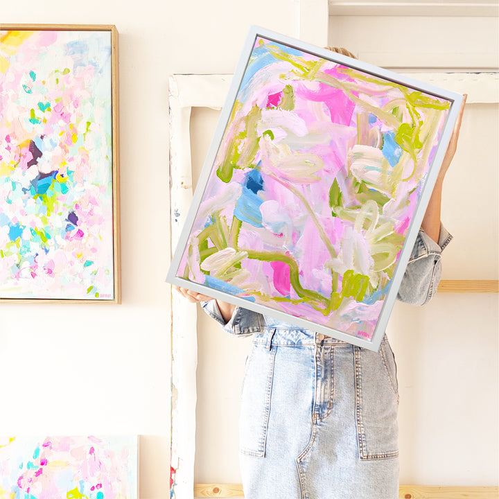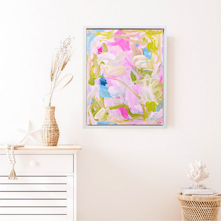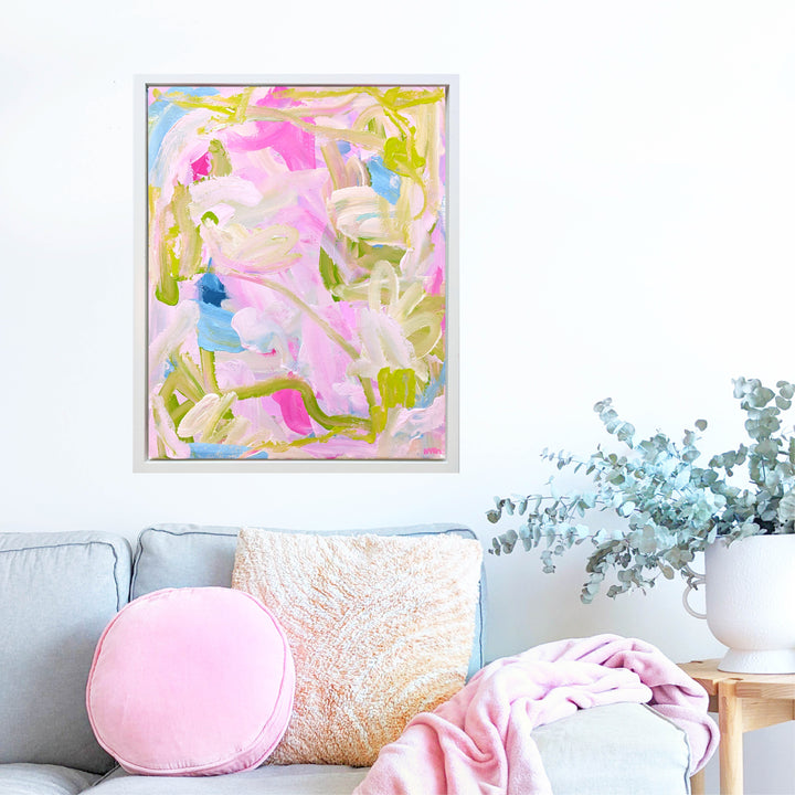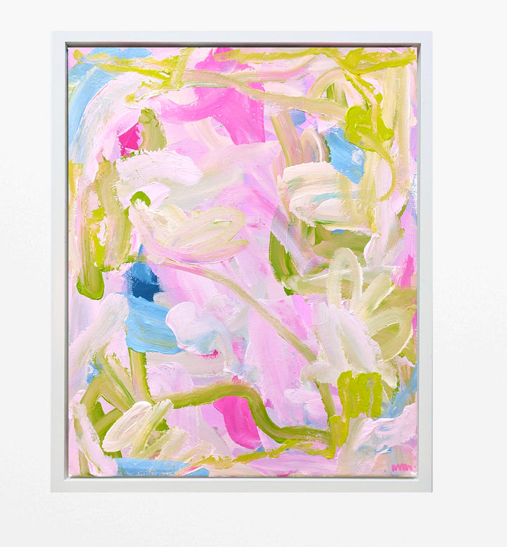 Acrylic on hand stretched canvas framed in a white floating frame.