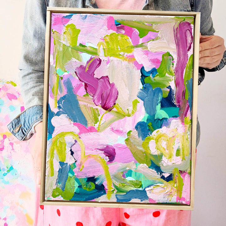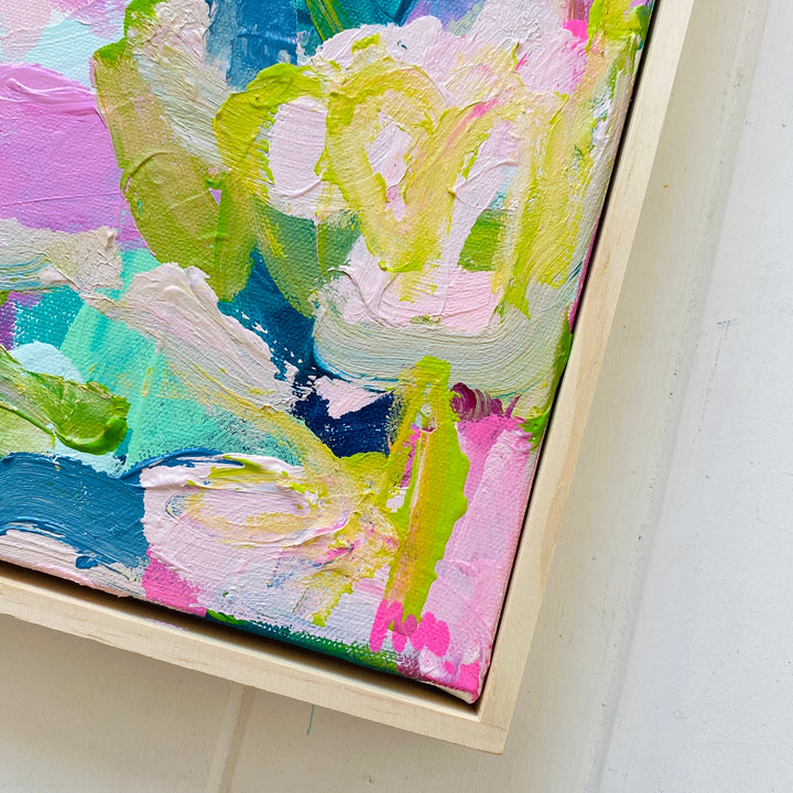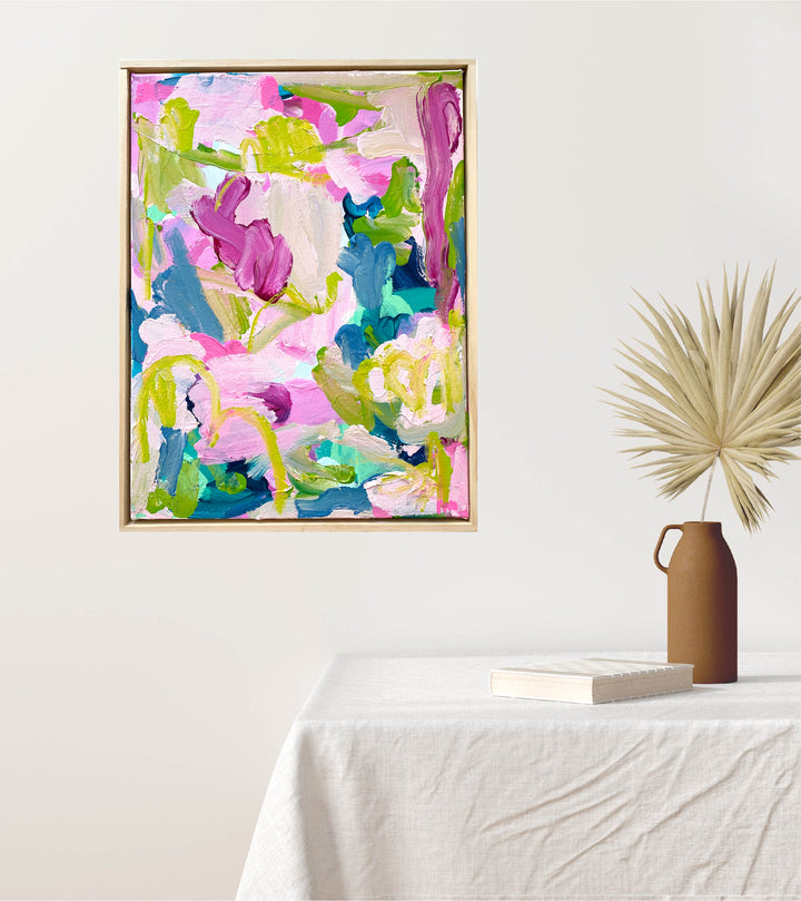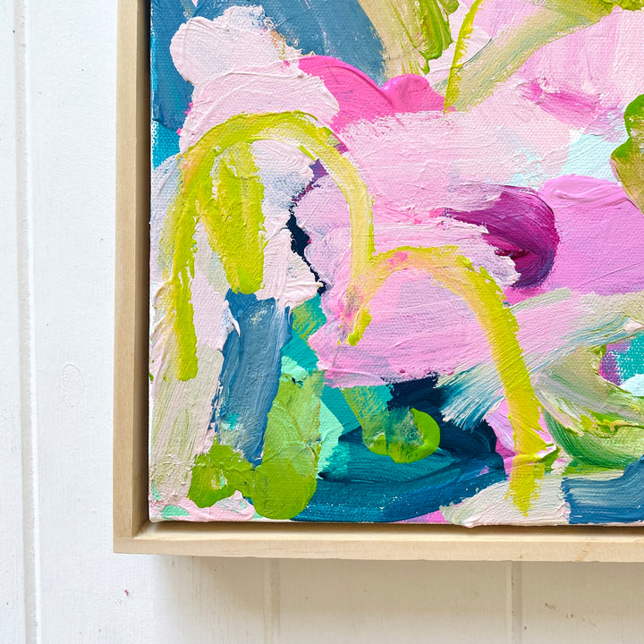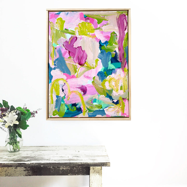 Acrylic on hand stretched canvas framed in a raw Pine floating frame.