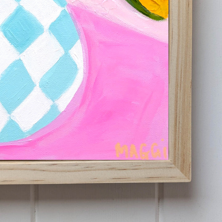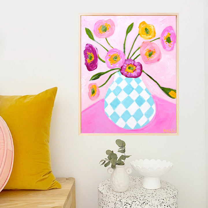 Acrylic on hand stretched canvas framed in raw timber frame.
