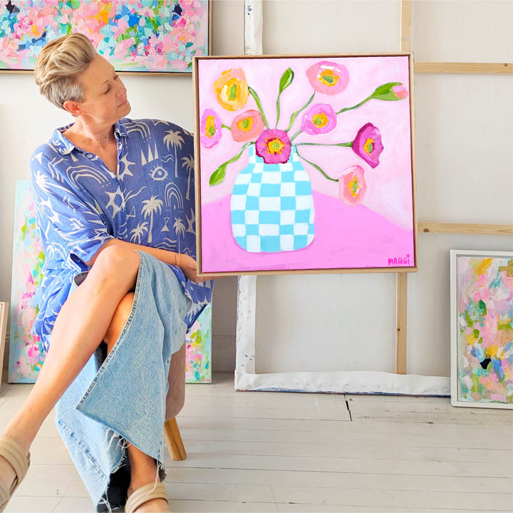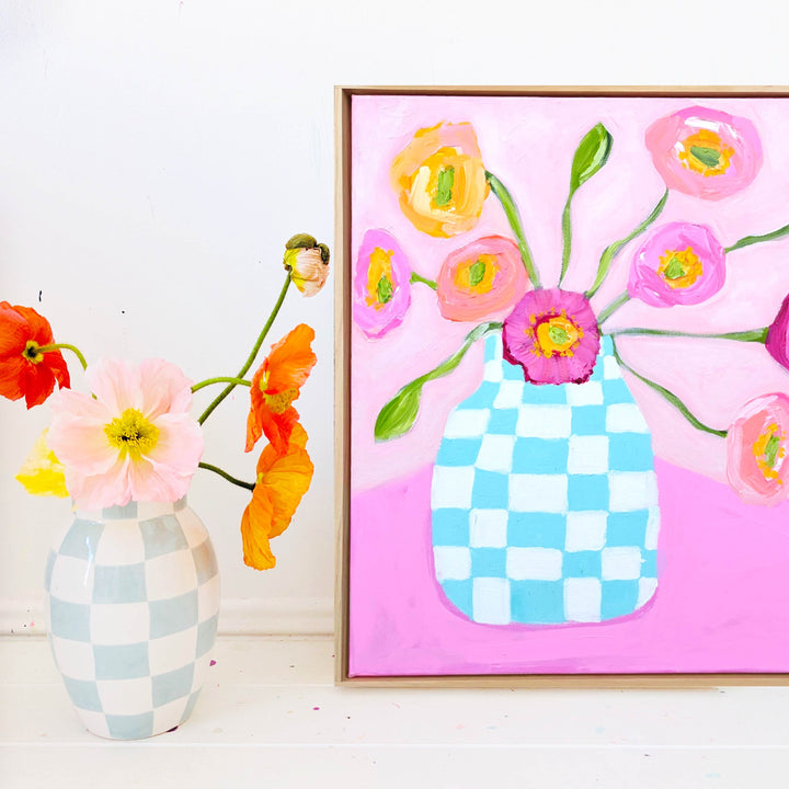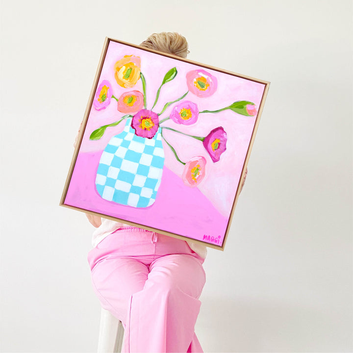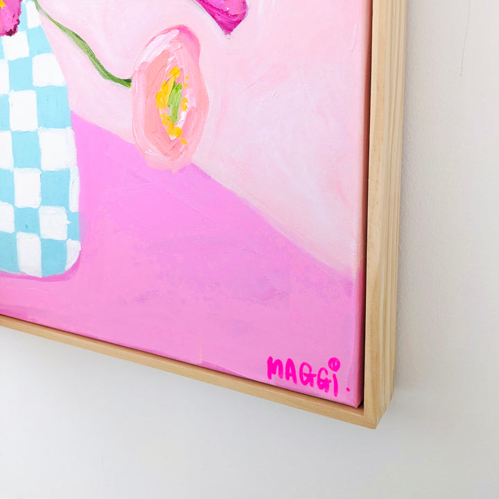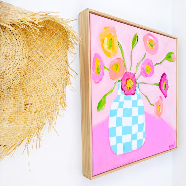 Acrylic on hand stretched canvas framed in a raw pine floating frame.