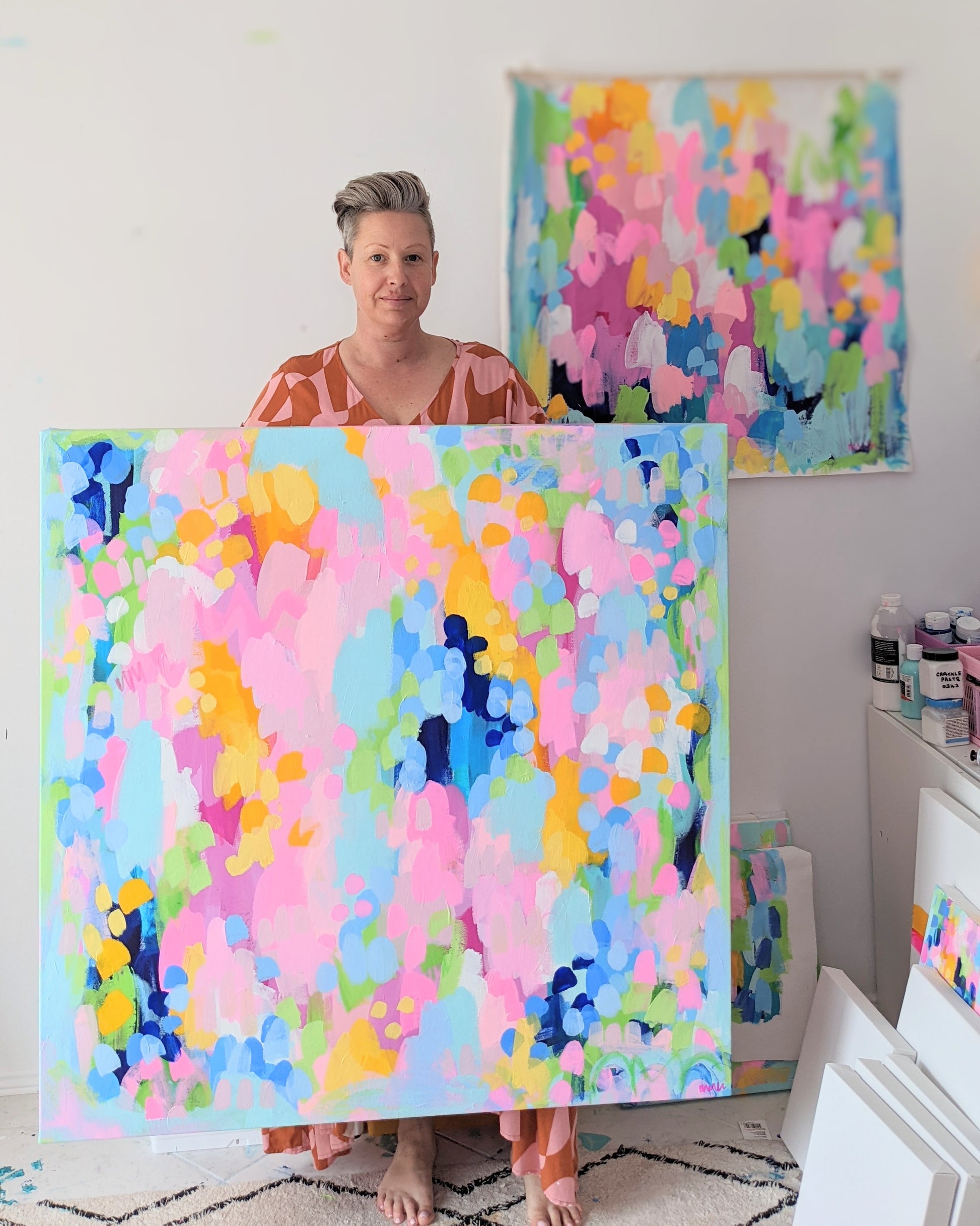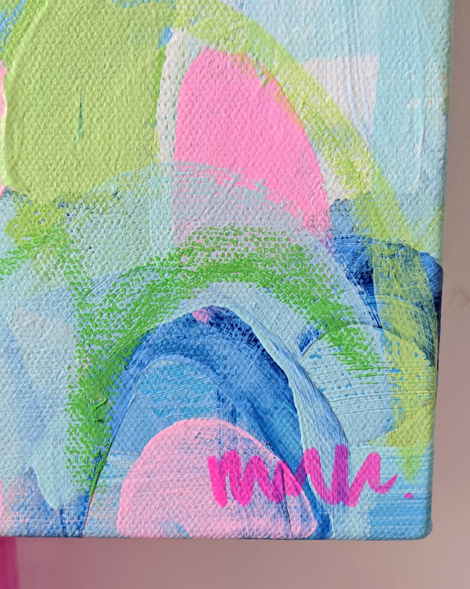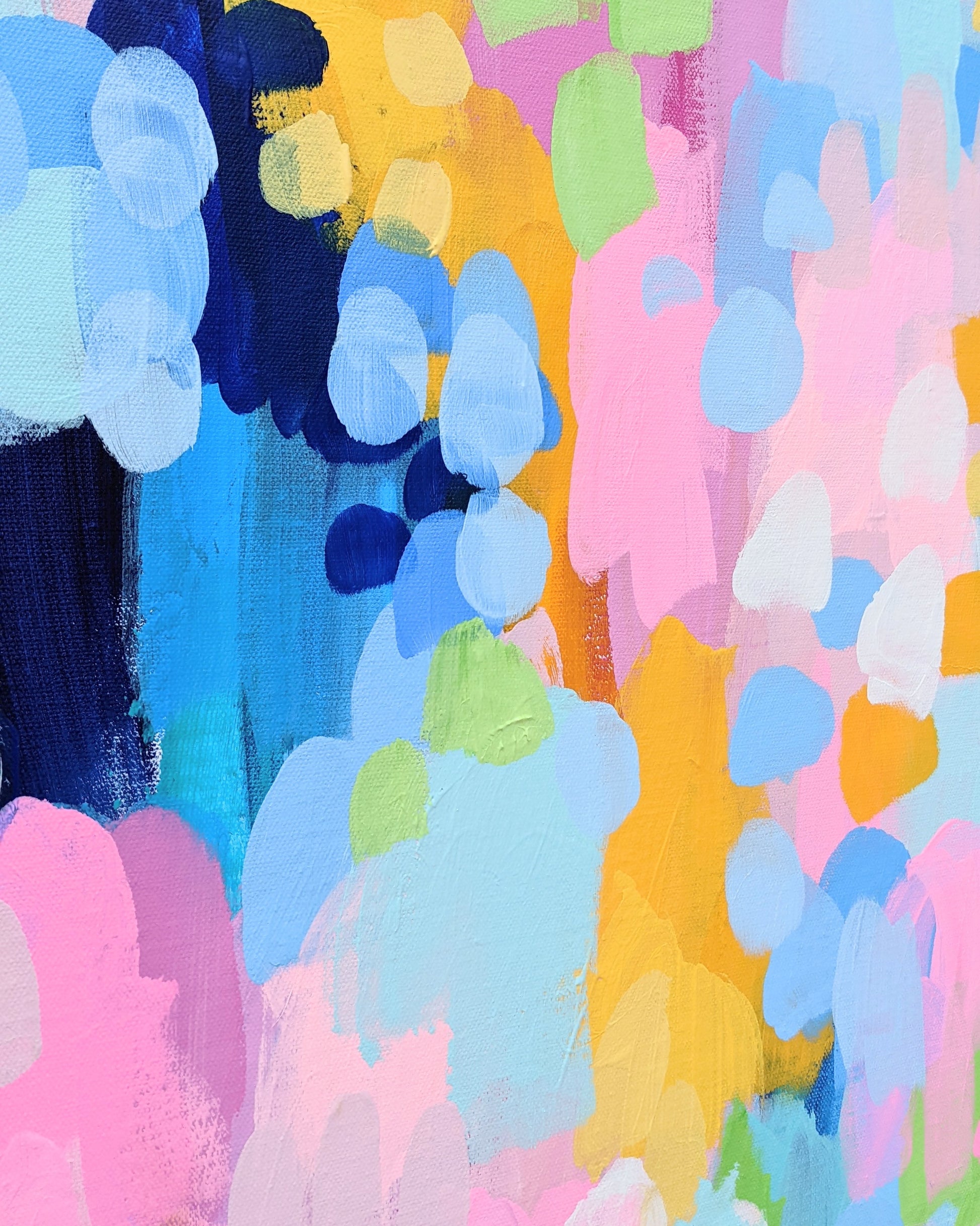 The first artworks in my new Dopamine Garden Series. Bright, bold colour inspired by my grandmother's garden and fond memories from my childhood using my signature bright colour palette. Bright abstract in my signature palette with lots of energy.