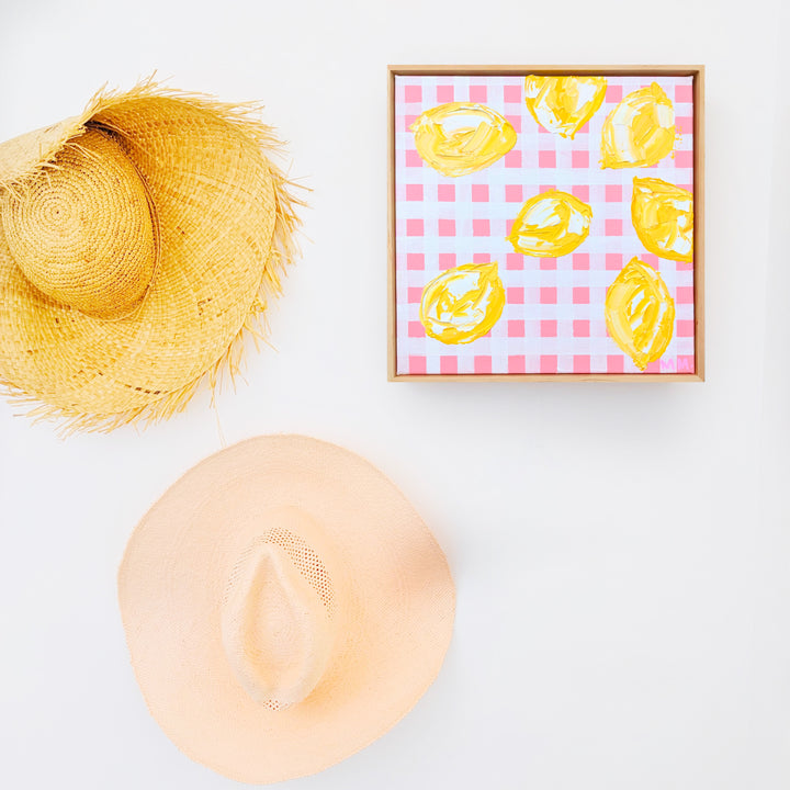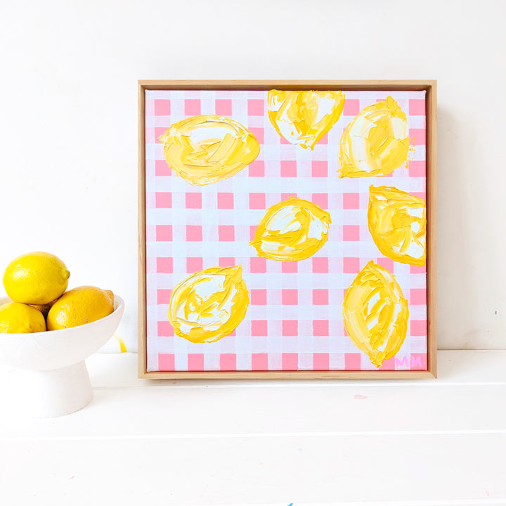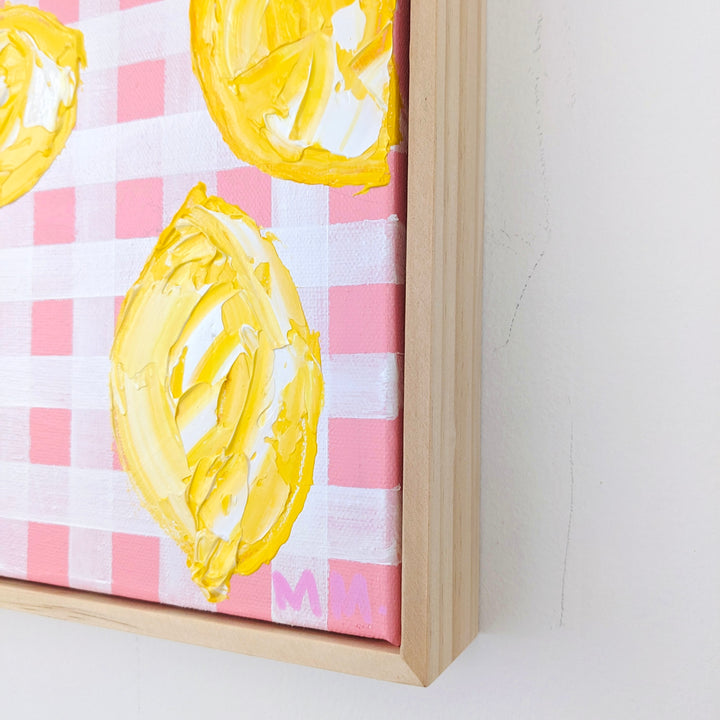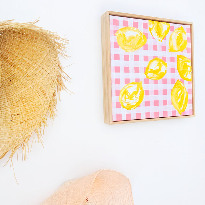 Acrylic on hand stretched canvas framed in a raw Pine floating frame.