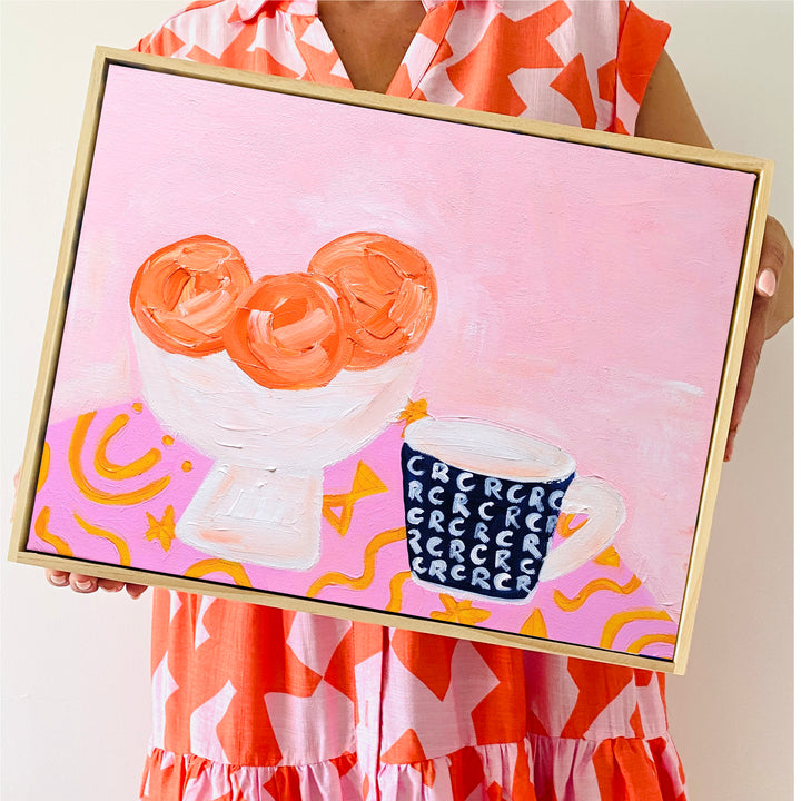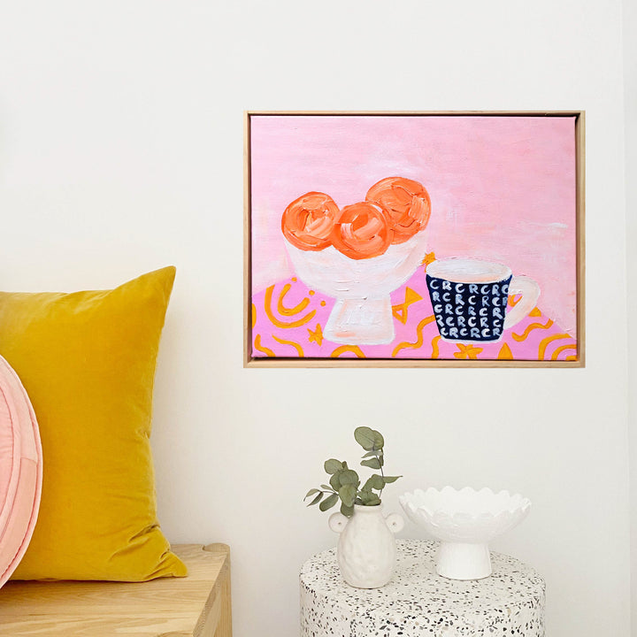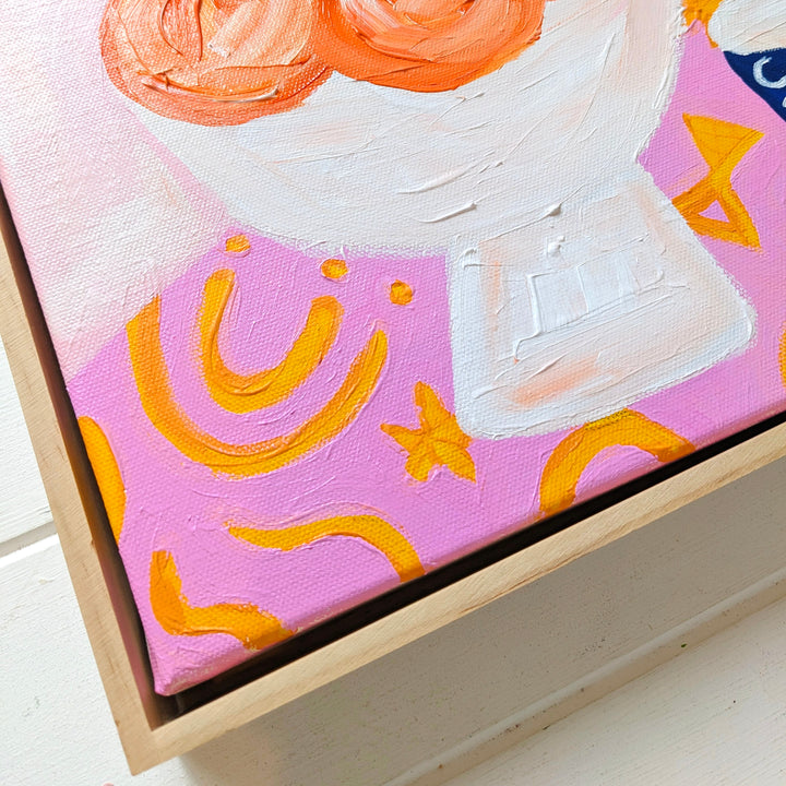 Acrylic on hand stretched canvas framed in a raw Pine floating frame.